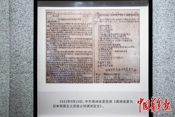 1931年9月19日ღ◈,中共满洲省委发表《满洲省委为日本帝国主义武装占领满洲宣言》ღ◈。(翻拍自“九·一八”历史博物馆)中青报·中青网记者 李隽辉/摄